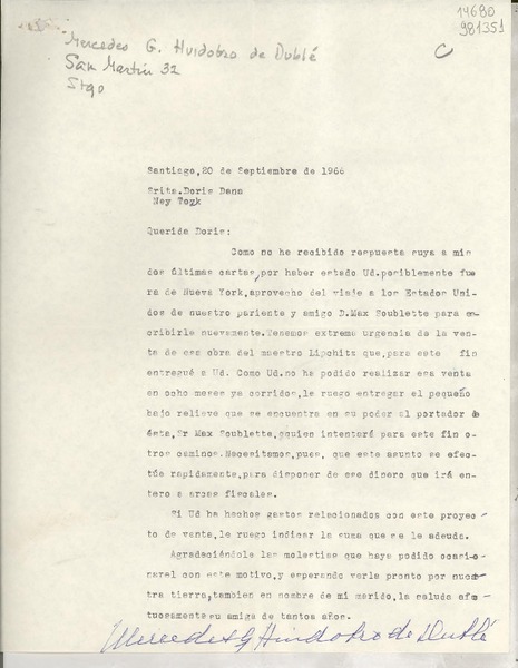 [Carta] 1966 sept. 20, Santiago, [Chile] [a] Srita. Doris Dana [manuscrito] Mercedes G. Huidobro de Dublé.