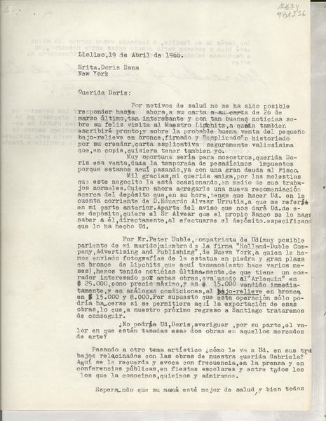 [Carta] 1966 abr. 19, Llolleo, [Chile] [a la] Srta. Doris Dana, New York, [EE.UU.] [manuscrito] Mercedes G. Huidobro de Dublé.