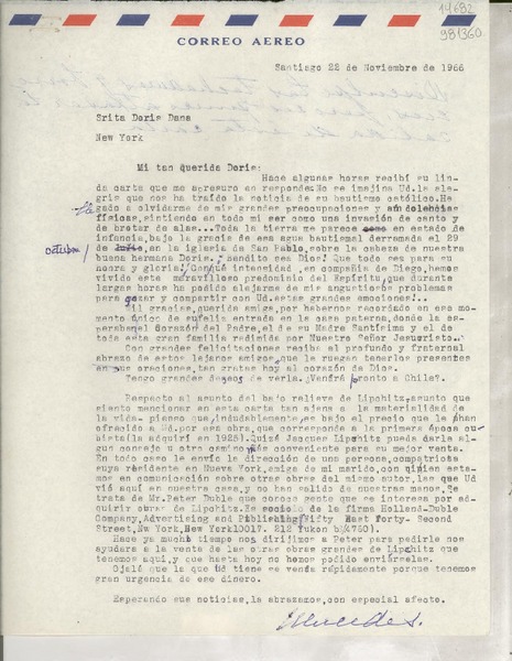 [Carta] 1966 nov. 22, Santiago, [Chile] [a] Srita. Doris Dana, New York [manuscrito] Mercedes G. Huidobro de Dublé.