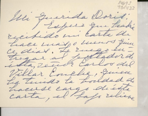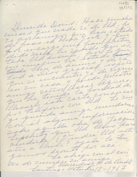 [Carta] 1967 oct. 18, Santiago, [Chile] [a] Querida Doris [manuscrito] Mercedes H. de Dublé.
