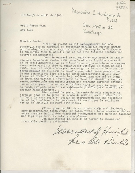 [Carta] 1967 abr. 5, Llolleo, [Chile] [a] Srita. Doris Dana, New York [manuscrito] Mercedes G. Huidobro de Dublé.