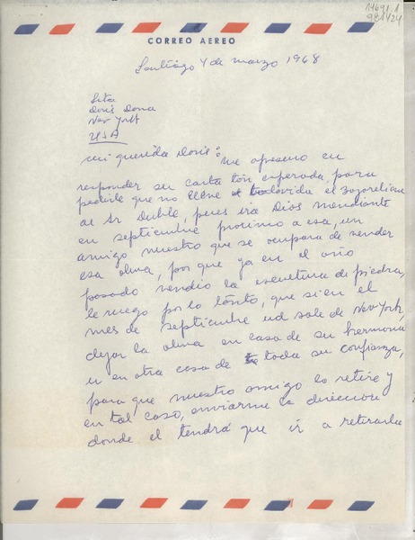 [Carta] 1968 mar. 4, Santiago, [Chile] [a la] Srta. Doris Dana, New York, [EE.UU.] [manuscrito] Mercedes G. H. de Dublé.