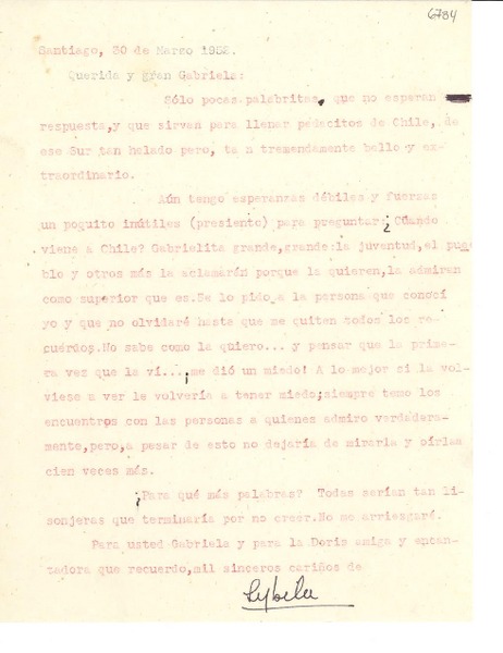 [Carta] 1952 mar. 30, Santiago, [Chile] [a] Gabriela [Mistral] [manuscrito] Sybila [Arredondo Ladrón de Guevara].