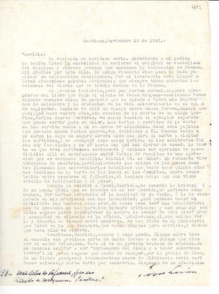 [Carta] 1943 nov. 12, Santiago, [Chile] [a] Gabriela [Mistral]