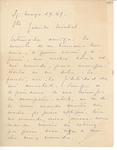 [Carta] 1947 mayo 29, [Santiago, Chile] [a] Gabriela Mistral