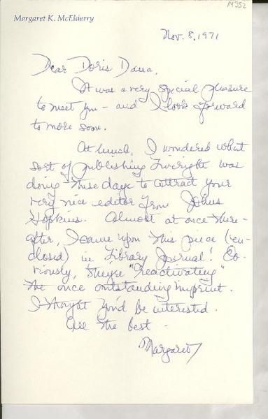 [Carta] 1971 Nov. 8, [EE.UU.] [a] Dear Doris Dana [manuscrito] Margaret [K. McElderry].