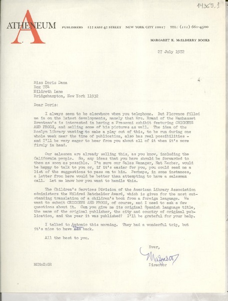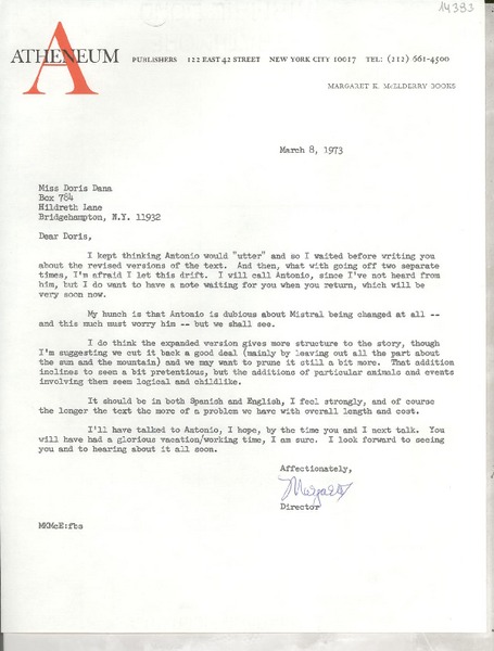[Carta] 1973 Sept. 27, Atheneum publishers 122 East 42 Street, New York City 10017, [EE.UU.] [a] Miss Doris Dana, Box 784, Hildreth Lane, Bridgehampton, N. Y. 11932, [EE.UU.] [manuscrito] Margaret [K. McElderry].