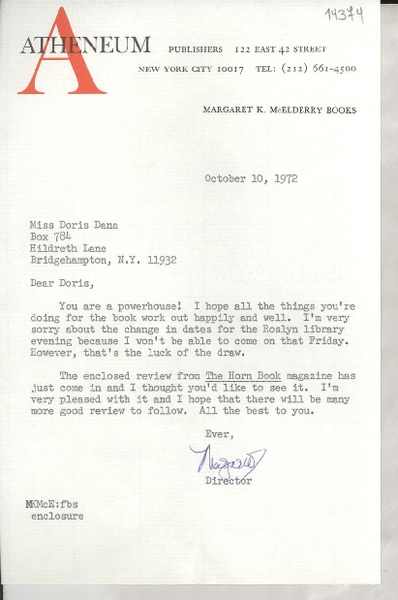 [Carta] 1972 Oct. 15, [New York, Estados Unidos] [a] Dear Doris [manuscrito] Margaret K. McElderry.