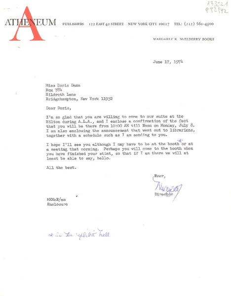 [Carta] 1974 June 17, Atheneum publishers 122 East 42 Street, New York City 10017, [EE.UU.] [a] Miss Doris Dana, Box 784, Hildreth Lane, Bridgehampton, N. Y. 11932, [EE.UU.] [manuscrito] Margaret K. McElderry.