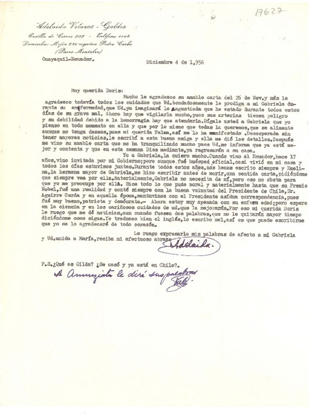 [Carta] 1956 dic. 4, Guayaquil, Ecuador [a] Doris Dana, [New york] [manuscrito] Adelaida Velasco Galdós.