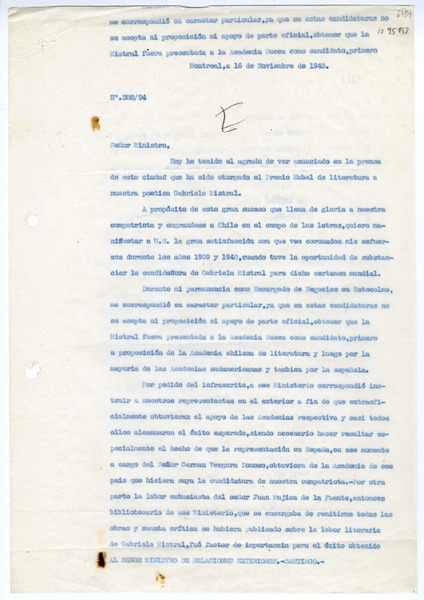 [Oficio N° 38894] 1945 noviembre 16, Montreal, Canadá [al] Ministro de Relaciones Exteriores, Santiago, Chile [manuscrito] / Carlos Errázuriz.