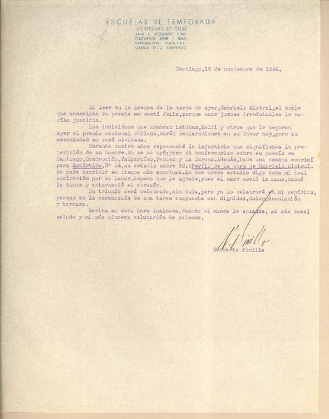 [Carta] 1945 nov. 16, Santiago, [Chile] [a] Gabriela Mistral [manuscrito] Norberto Pinilla.