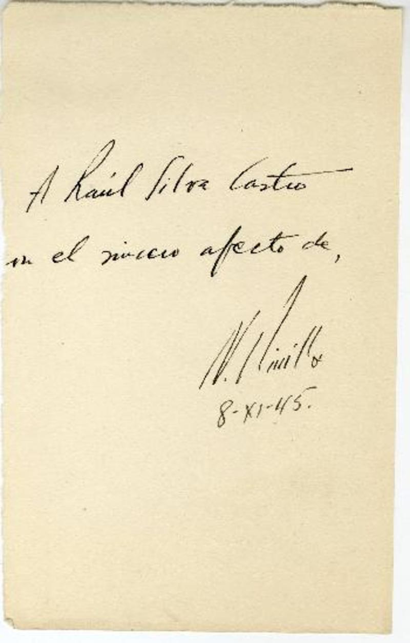 [Dedicatoria] 1945 noviembre 8, Santiago, Chile [a] Raúl Silva Castro [manuscrito] Norberto Pinilla.