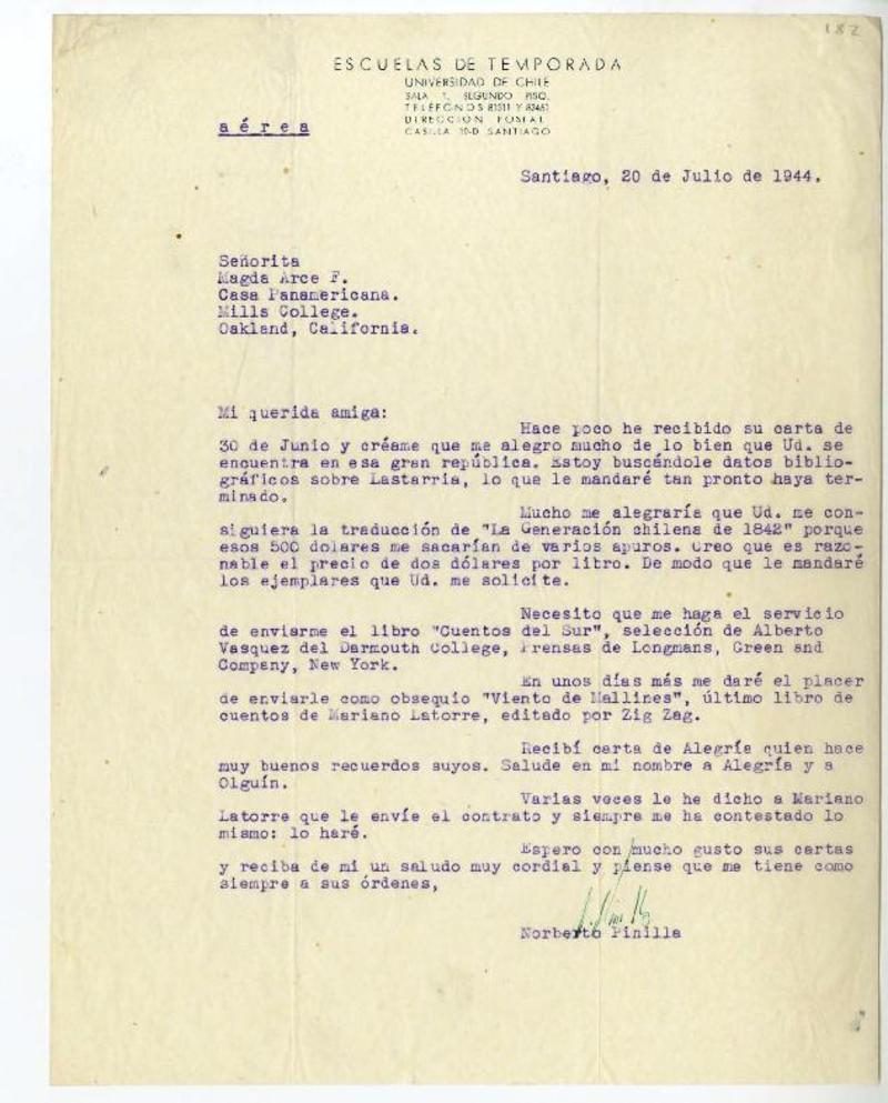 Santiago, Chile [a] Magda Arce, Casa Panamericana, Mills College, Oakland, California carta, 1944 julio 20, [manuscrito] Norberto Pinilla.