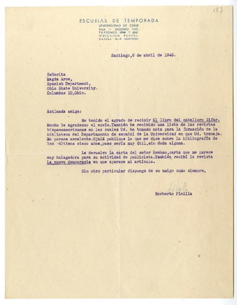 Santiago, Chile [a] Magda Arce, Spanish Department, Ohio State University, Ohio Carta, 1945 abril 06, [manuscrito] Norberto Pinilla.