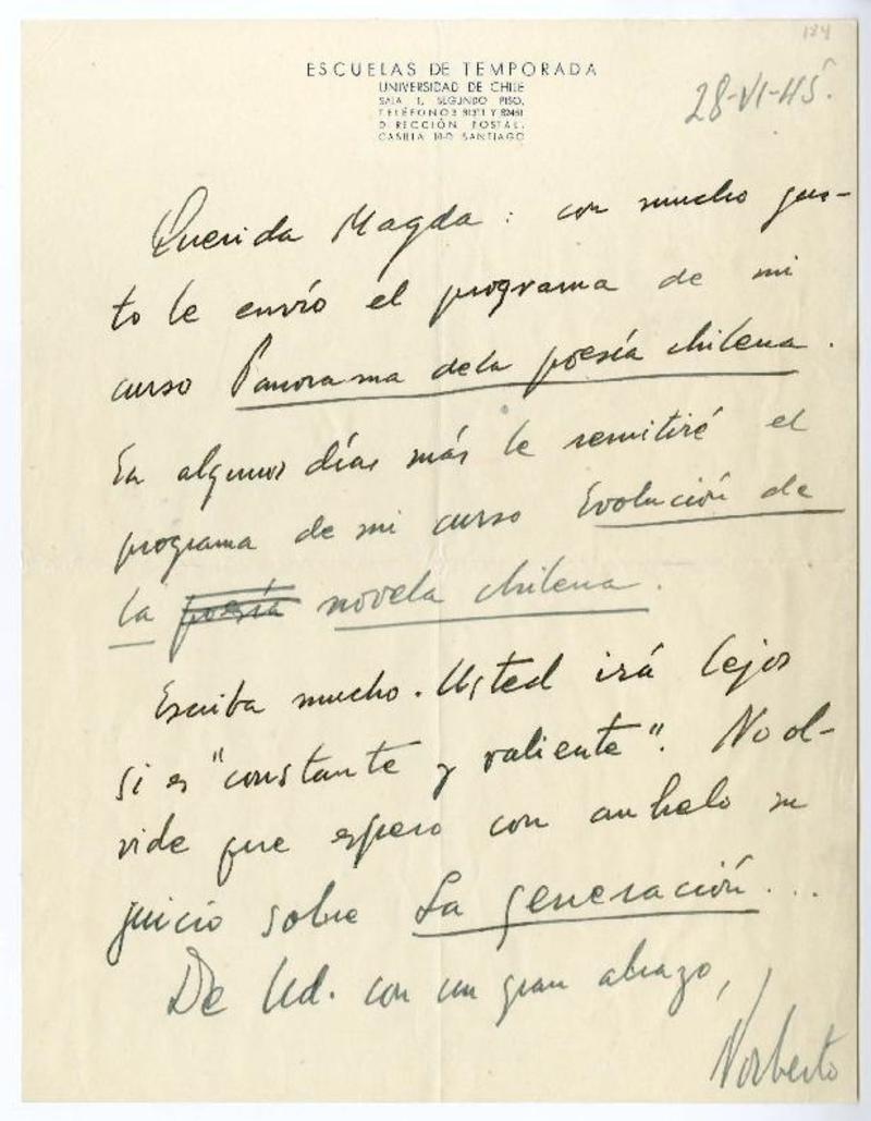 Santiago, Chile [a] Magda Arce Carta, 1945 junio 28, [manuscrito] Norberto Pinilla.