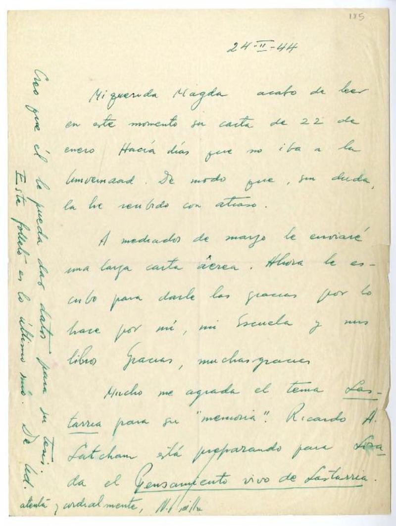 Santiago, Chile [a] Magda Arce Carta, 1944 febrero 24, [manuscrito] Norberto] Pinilla.