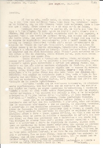[Carta] 1949 mayo 24, Los Angeles, [EE.UU.] [a] [Gabriela Mistral] [manuscrito] Vinicius [de Moraes].