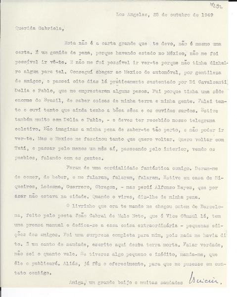 [Carta] 1949 mar. 28, Los Angeles, [EE.UU.] [a] Gabriela [Mistral] [manuscrito] Vinicius [de Moraes].
