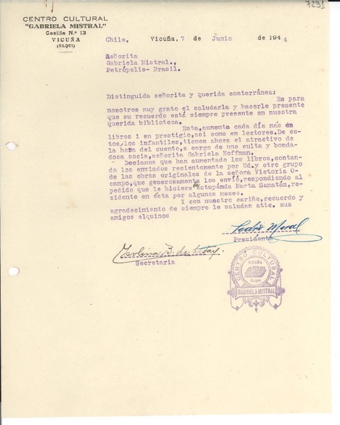 [Carta] 1944 jun. 7, Vicuña [Chile] [a] Gabriela Mistral, Petrópolis, Brasil [manuscrito] Pedro Moral.