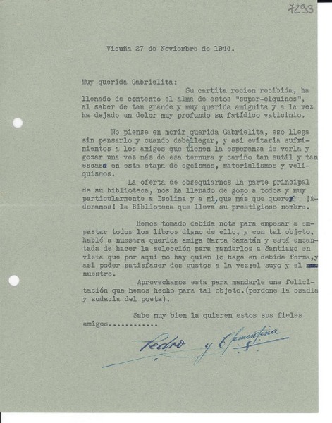[Carta] 1944 nov. 27, Vicuña [Chile] [a] Gabriela Mistral [manuscrito] Pedro Moral.