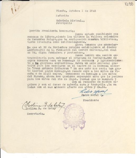[Carta] 1945 oct. 4, Vicuña [Chile] [a] Gabriela Mistral [manuscrito] Pedro Moral.