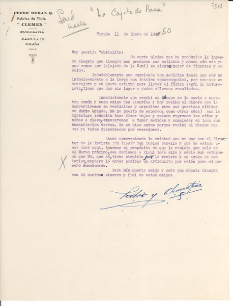 [Carta] 1950 ene. 11, Vicuña, [Chile] [a] Gabrielita [Mistral] [manuscrito] Pedro [Moral Q.].