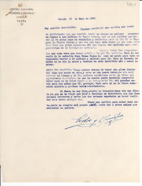 [Carta] 1950 mayo 27, Vicuña, [Chile] [a] Gabrielita [Mistral] [manuscrito] Pedro [Moral Q.].