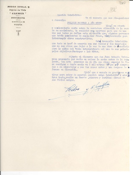 [Carta] [1951?], [Vicuña?], [Chile] [a] Gabrielita [Mistral] [manuscrito] Pedro [Moral Q.].