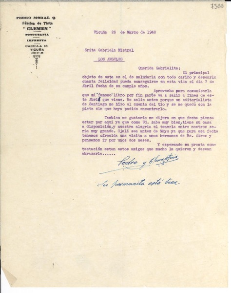 [Carta] 1946 mar. 26, Vicuña [Chile] [a] Gabriela Mistral, Los Ángeles [manuscrito] Pedro Moral.