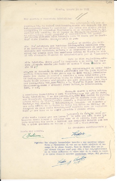 [Carta] 1951 ago. 5, Vicuña, [Chile] [a] Gabriela Mistral, Rapallo, Italia [manuscrito] Pedro Moral, Sara Santander R.