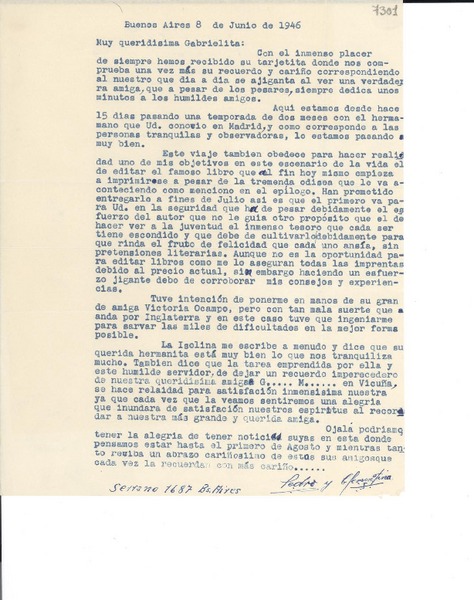 [Carta] 1946 jun. 8, Buenos Aires [a] Gabriela Mistral [manuscrito] Pedro Moral.