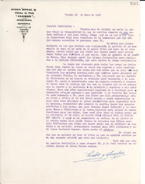[Carta] 1947 mayo 18, Vicuña [Chile] [a] Gabriela Mistral [manuscrito] Pedro Moral.