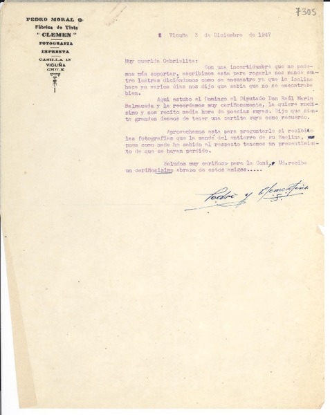 [Carta] [1947, Vicuña, Chile] [a] Gabriela Mistral [manuscrito] Pedro Moral.