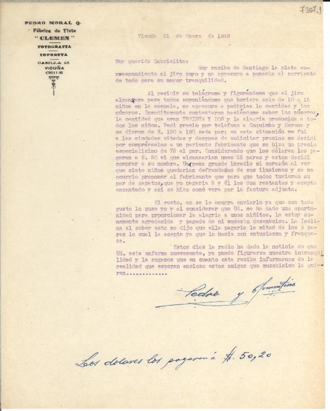 [Carta] 1948 ene. 21, Vicuña [Chile] [a] Gabriela Mistral [manuscrito] Pedro Moral.
