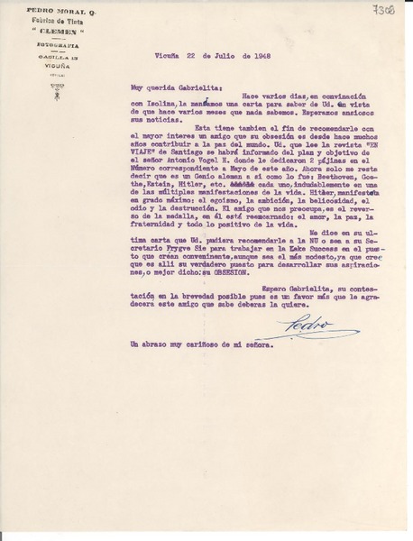 [Carta] 1948 jul. 22, Vicuña [Chile] [a] Gabriela Mistral [manuscrito] Pedro Moral.