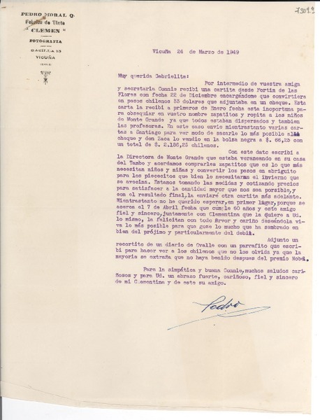 [Carta] 1949 mar. 24, Vicuña [Chile] [a] Gabriela Mistral [manuscrito] Pedro Moral.