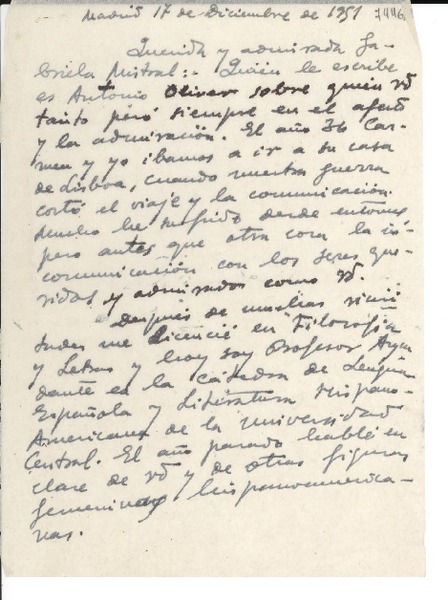 [Carta] 1951 dic. 17, Madrid [a] Gabriela Mistral [manuscrito] Antonio Oliver.