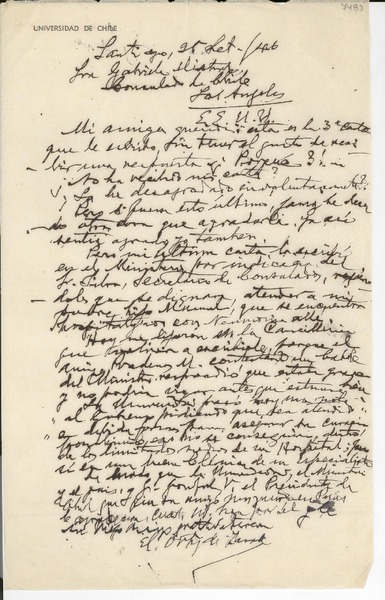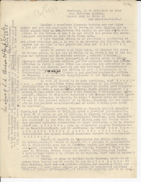 [Carta] 1946 sept. 14, Santiago, [Chile] [a] Gabriela Mistral, Los Angeles, EE.UU. [manuscrito] Eliodoro Ortíz Zárate.
