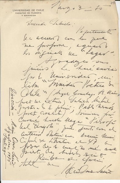[Carta] 1950 abr. 28, Santiago [a] Gabriela Mistral [manuscrito] Mario Osses Sáenz.
