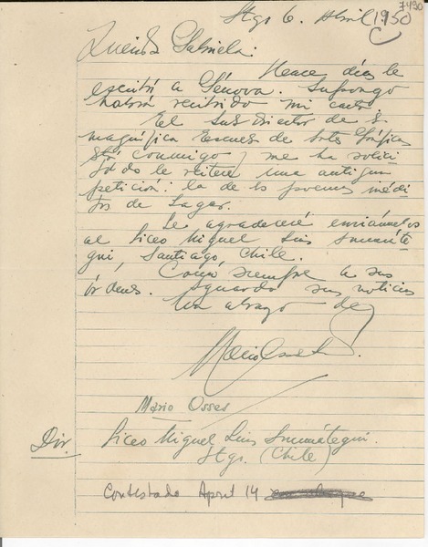 [Carta] 1950 abr. 6, Santiago [a] Gabriela Mistral [manuscrito] Mario Osses S.