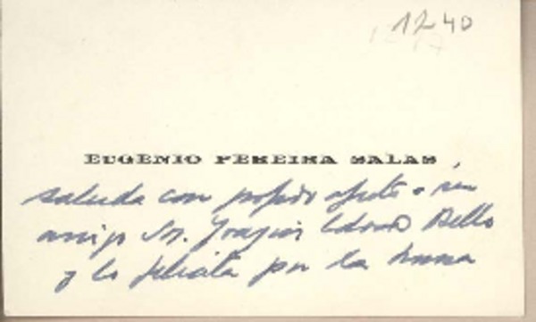 [Tarjeta] 1959 noviembre, Santiago, [Chile] [a] Joaquín Edwards Bello [manuscrito] Eugenio Pereira Salas.