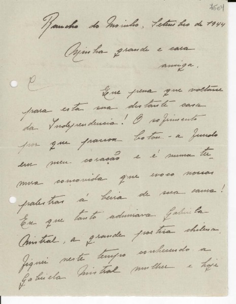 [Carta] 1944 set., Rancho do Morinho, [Brasil] [a] Gabriela Mistral [manuscrito] Elora [Possolo Chaoul].