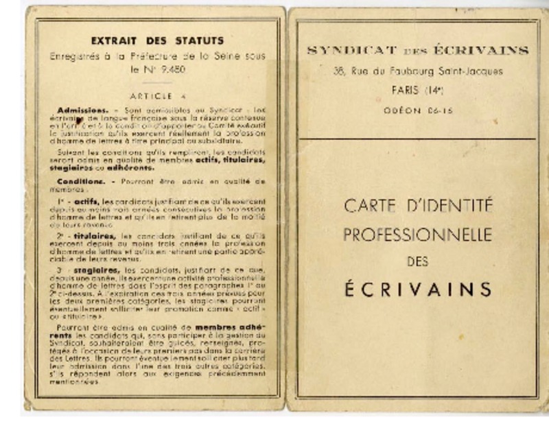 Carné de identidad del sindicato de escritores de París. [manuscrito] Alberto Ried Silva.