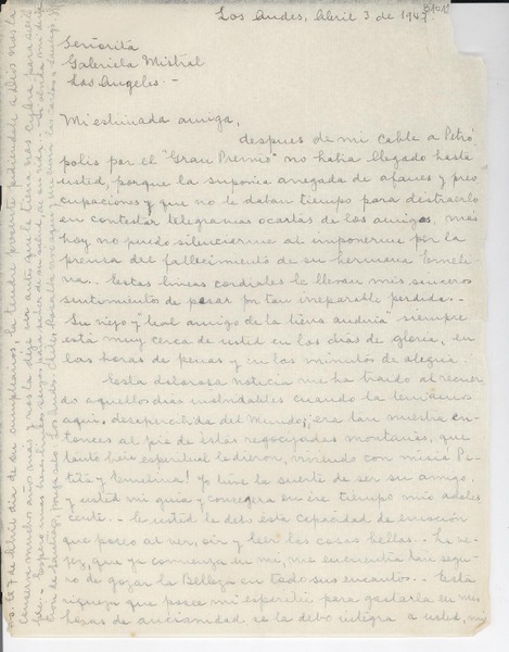 [Carta] 1947 abr. 3, Los Andes, [Chile] [a] Gabriela Mistral, Los Angeles, [EE.UU.] [manuscrito] Isauro [Santelices].