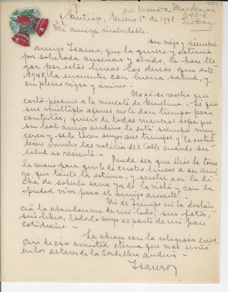 [Carta] 1948 ene. 1, Santiago, [Chile] [a] [Gabriela Mistral] [manuscrito] Isauro [Santelices].