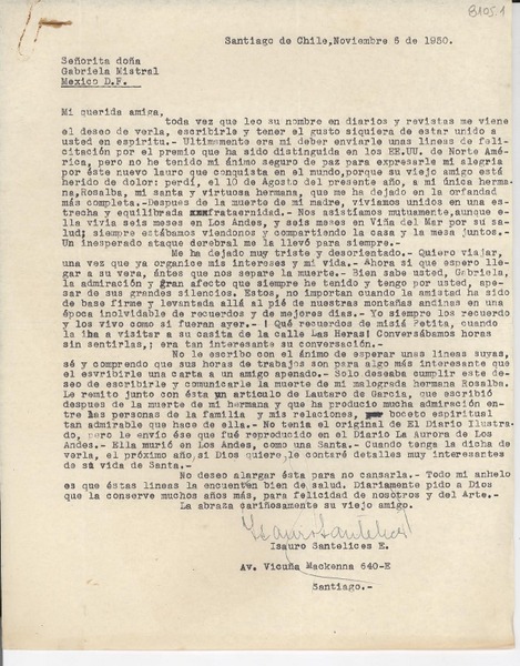 [Carta] 1950 nov. 6, Santiago, Chile [a] [Gabriela Mistral], México D.F. [manuscrito] Isauro de los Andes Santelices E.