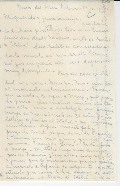 [Carta] 1951 feb. 11, Viña del Mar, [Chile] [a] [Gabriela Mistral] [manuscrito] Isauro de los Andes.