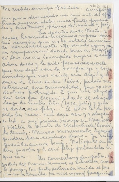 [Carta] [1951], [Chile] [a] Gabriela [Mistral] [manuscrito] Isauro de los Andes.