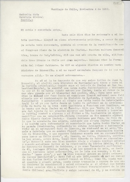 [Carta] 1952 nov. 4, Santiago, Chile [a] Gabriela Mistral, Nápoles [manuscrito] Isauro [Santelices].